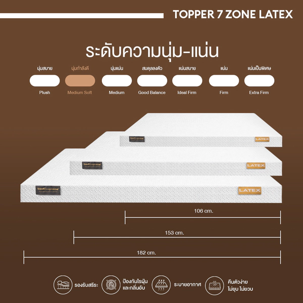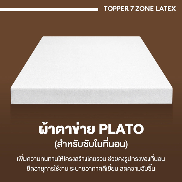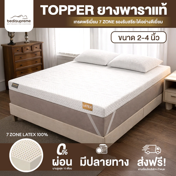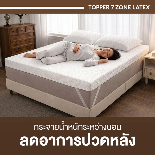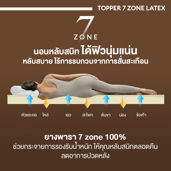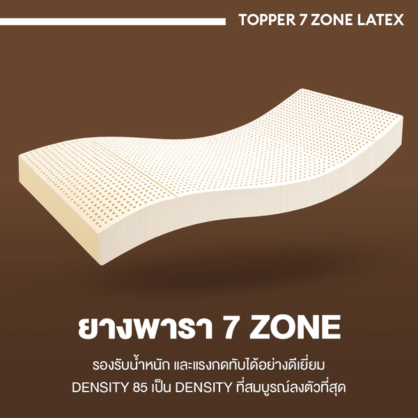 ยกระดับการนอนให้สบายและรองรับสรีระยิ่งขึ้น ด้วยท็อปเปอร์ยางพาราฉีดแท้ 100% ระบบ 7 โซน เพื่อรองรับสรีระในแต่ละส่วนอย่างเหมาะสม ช่วยลดแรงกดทับ เพิ่มความสบาย และช่วยให้หลับลึกตลอดคืน เหมาะสำหรับวางเสริมบนที่นอนทุกประเภท